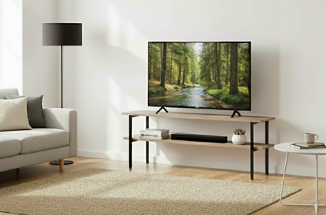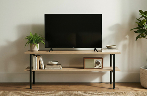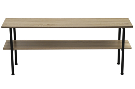 Mesa auxiliar / TV con estante inferior Tapa y estante en melamina color roble Estructura metálica color negro Medidas : 120 x 30 x 48 cm – Unidad venta : caja 1 Ud – Volumen : 0 025 M 3 x Ud Entradas previstas : 99 Ud(s) – 08/03 Colores disponibles : Oak / Negro 99 Ud(s) – 08/03 99 Ud(s) – 08/03