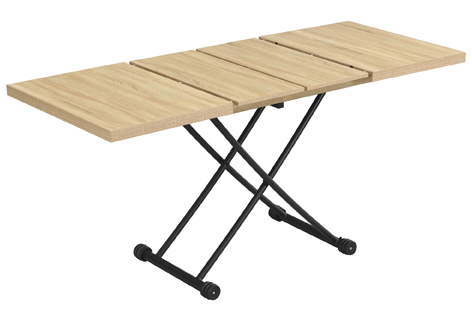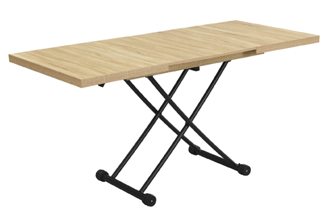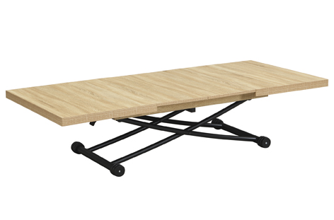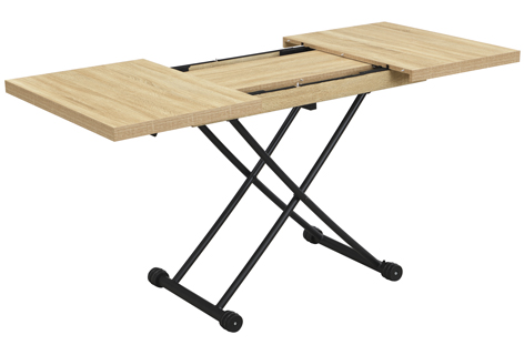 Mesa centro elevable y extensible Tapa y extensibles en melamina 2 Extensibles independientes 30 cm bajo la tapa Elevacíon a gas Accionamiento mediante tirador Estructura metálica color negro Medidas : 100 – 130 – 160 x 80 x 28 – 75 cm – Unidad venta : caja 1 Ud – Volumen : 0 149 M 3 x Ud Entradas previstas : 100 Ud(s) – 29/03 Colores disponibles : Oak / Negro 100 Ud(s) – 29/03 100 Ud(s) – 29/03