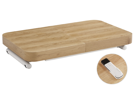 Mesa centro elevable y extensible Tapa y extensibles en melamina color oak 2 Extensibles independientes 40 cm bajo la tapa Estructura metálica color negro Elevacíon eléctrica con batería recargable Accionamiento mediante mando a distancia Medidas : 120 – 160 – 200 x 75 x 28 – 78 cm – Unidad venta : caja 1 Ud – Volumen : 0 358 M 3 x Ud Entradas previstas : 48 Ud(s) – 22/04 Colores disponibles : Oak / Negro 51 Ud(s) – 22/04 Oak / Blanco 48 Ud(s) – 22/04 51 Ud(s) – 22/04