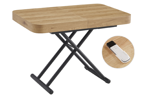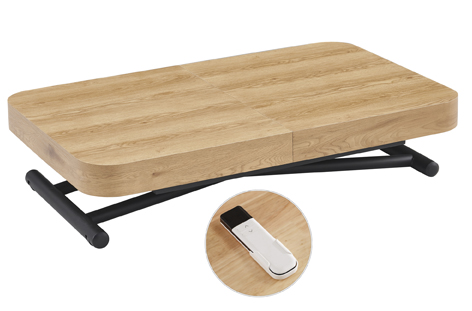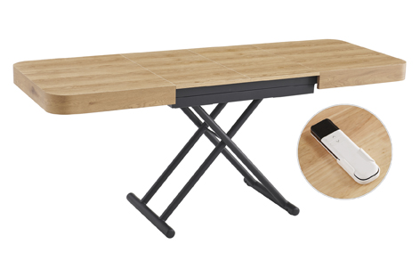 Mesa centro elevable y extensible Tapa y extensibles en melamina color oak 2 Extensibles independientes 40 cm bajo la tapa Estructura metálica color negro Elevacíon eléctrica con batería recargable Accionamiento mediante mando a distancia Medidas : 120 – 160 – 200 x 75 x 28 – 78 cm – Unidad venta : caja 1 Ud – Volumen : 0 358 M 3 x Ud Entradas previstas : 51 Ud(s) – 22/04 Colores disponibles : Oak / Negro 51 Ud(s) – 22/04 Oak / Blanco 48 Ud(s) – 22/04 51 Ud(s) – 22/04