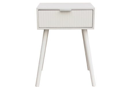 Mesilla de noche con patas nórdicas 1 cajón gran capacidad con frente decorativo lineas Color blanco Medidas: 40 x 30 x 60 cm – Unidad venta : caja 1 Ud – Volumen : 0 013 M 3 x Ud Entradas previstas : 200 Ud(s) – 10 / 12 semanas Colores disponibles : Blanco En stock : 108 Uds Pino / Rattan En stock : 740 Uds En stock : 108 Uds