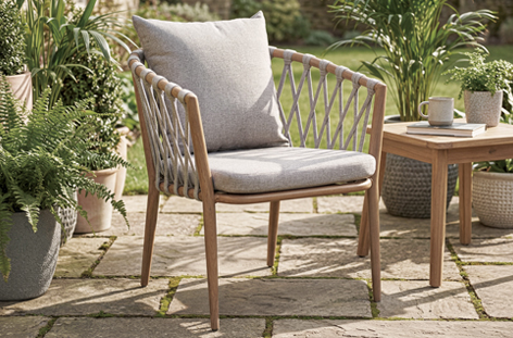 Sillón de exterior / interior Estructura en aluminio imaitación madera Respaldo decorativo trenzado en cuerda Cojines en tejido de poliéster gris Medidas: 57 x 60 x 77 cm – Unidad venta : caja 4 Uds – Volumen : 0 097 M 3 x Ud Entradas previstas : 284 Ud(s) – 15/04 Colores disponibles : Gris 296 Ud(s) – 15/04 Oak / Gris 284 Ud(s) – 15/04 296 Ud(s) – 15/04