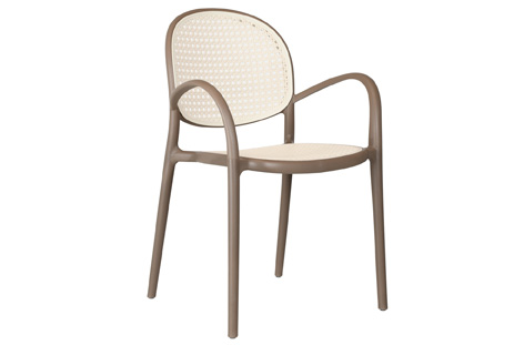 Sillón multiusos apilable Uso exterior / interior Polipropileno alta resistencia Asiento y respaldo imitación rattán Apoyabrazos Color topo / rattán